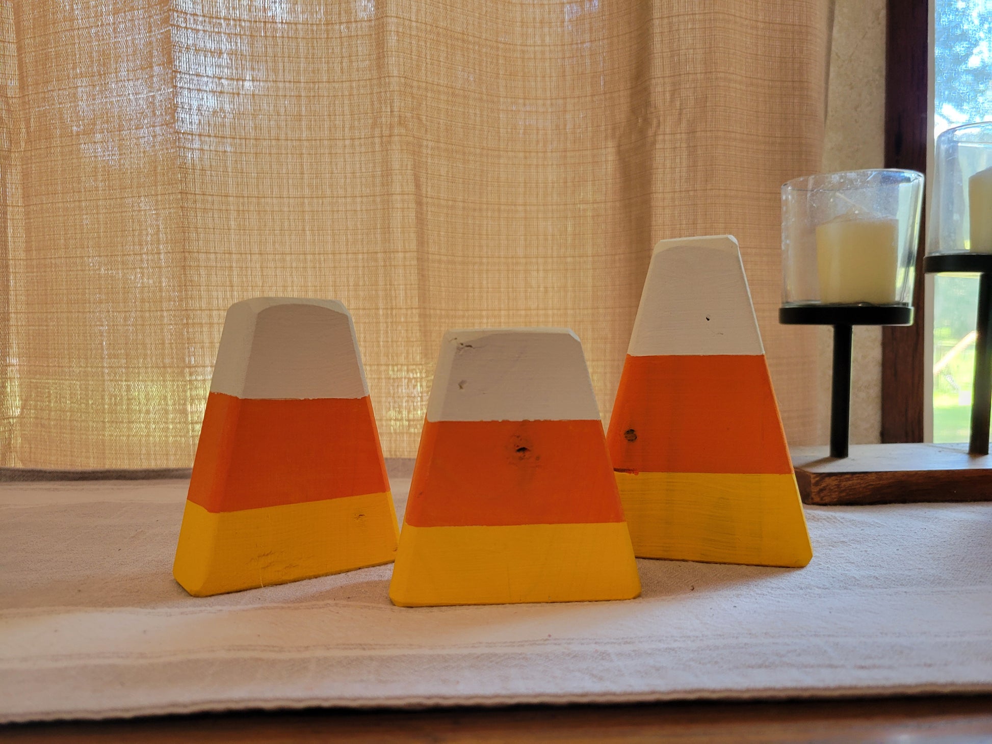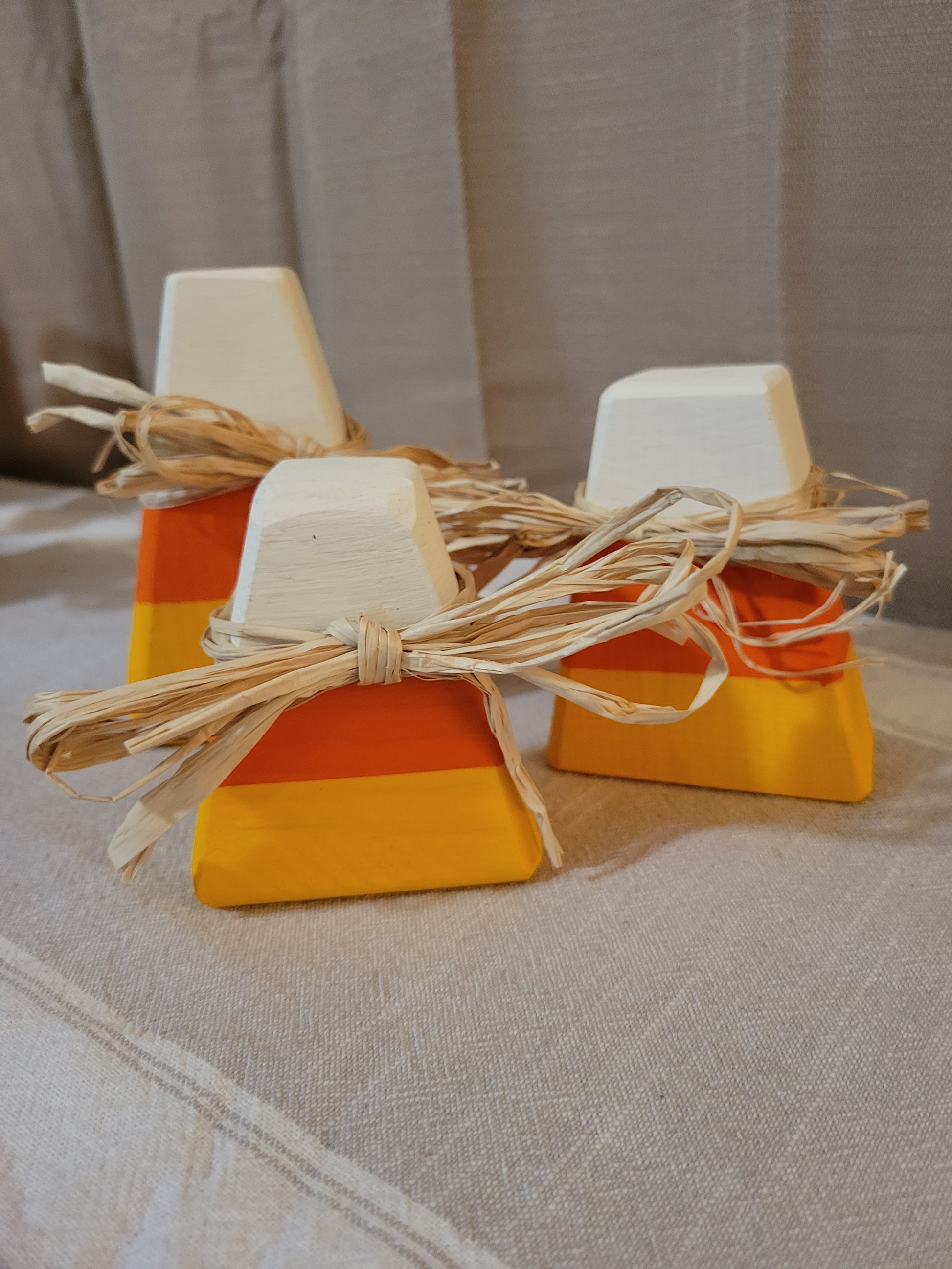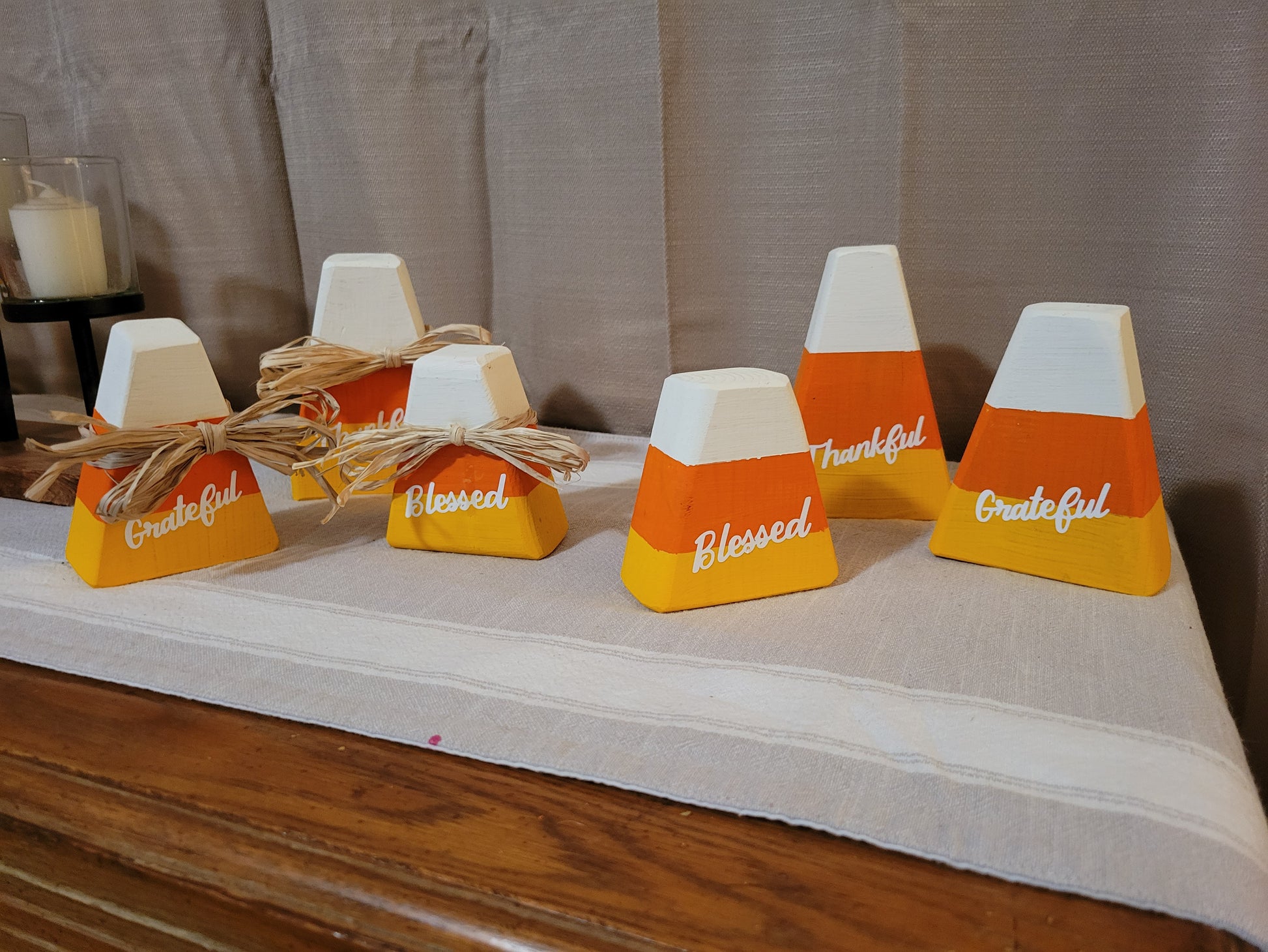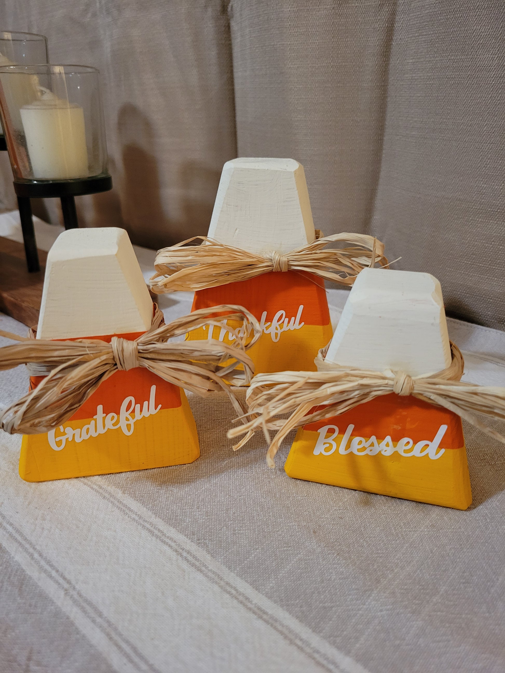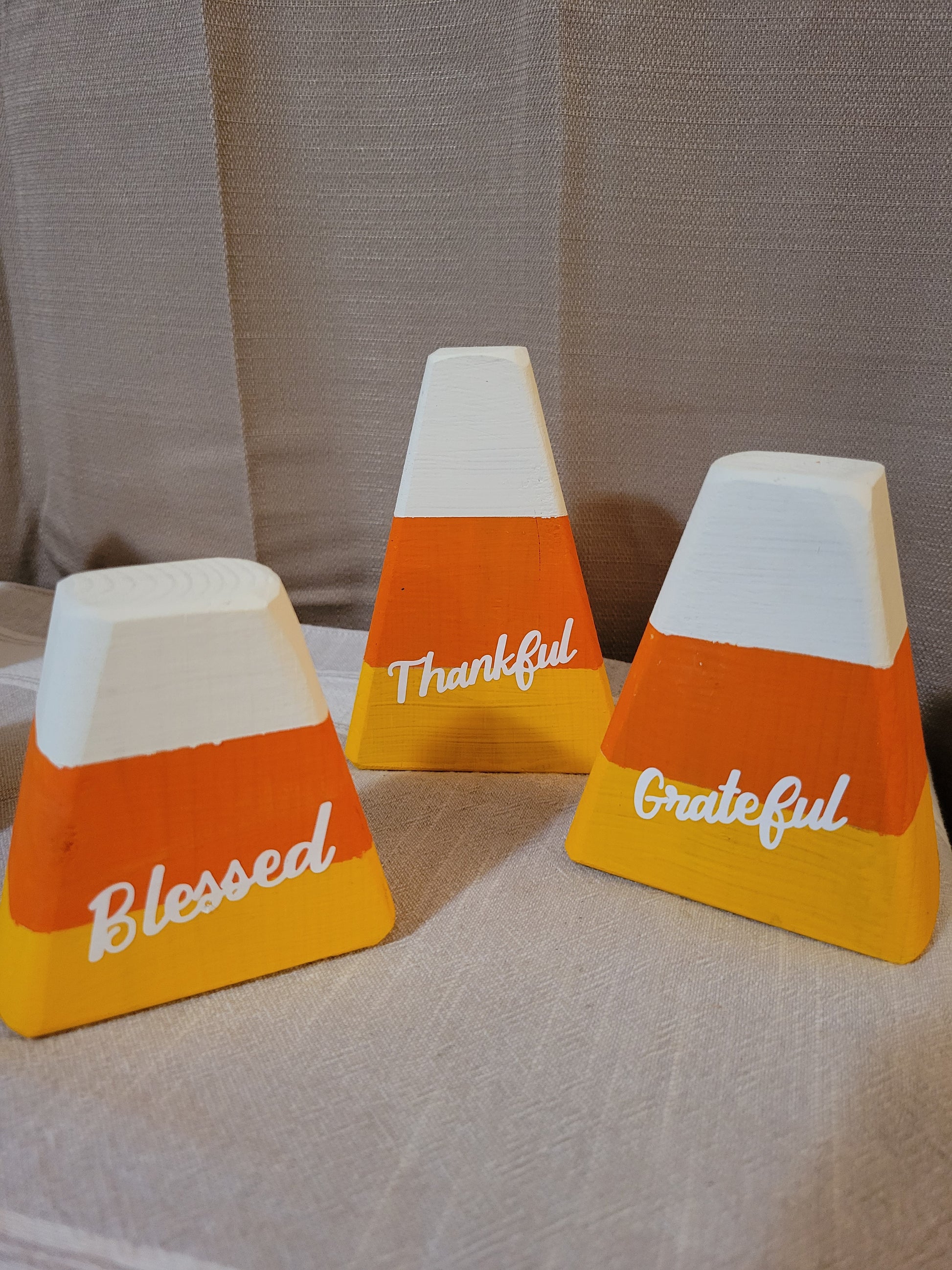 Small handcrafted Candy Corn set of 3 from 2x4 material, lightly distressed with Thankful, Grateful, and Blessed or plain. Each piece is hand-coated twice with exterior paint to open up full creativity for indoor/outdoor decorating options. Made with love from our home to yours.