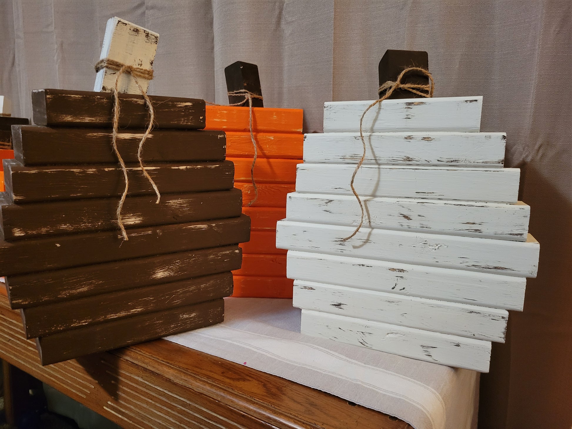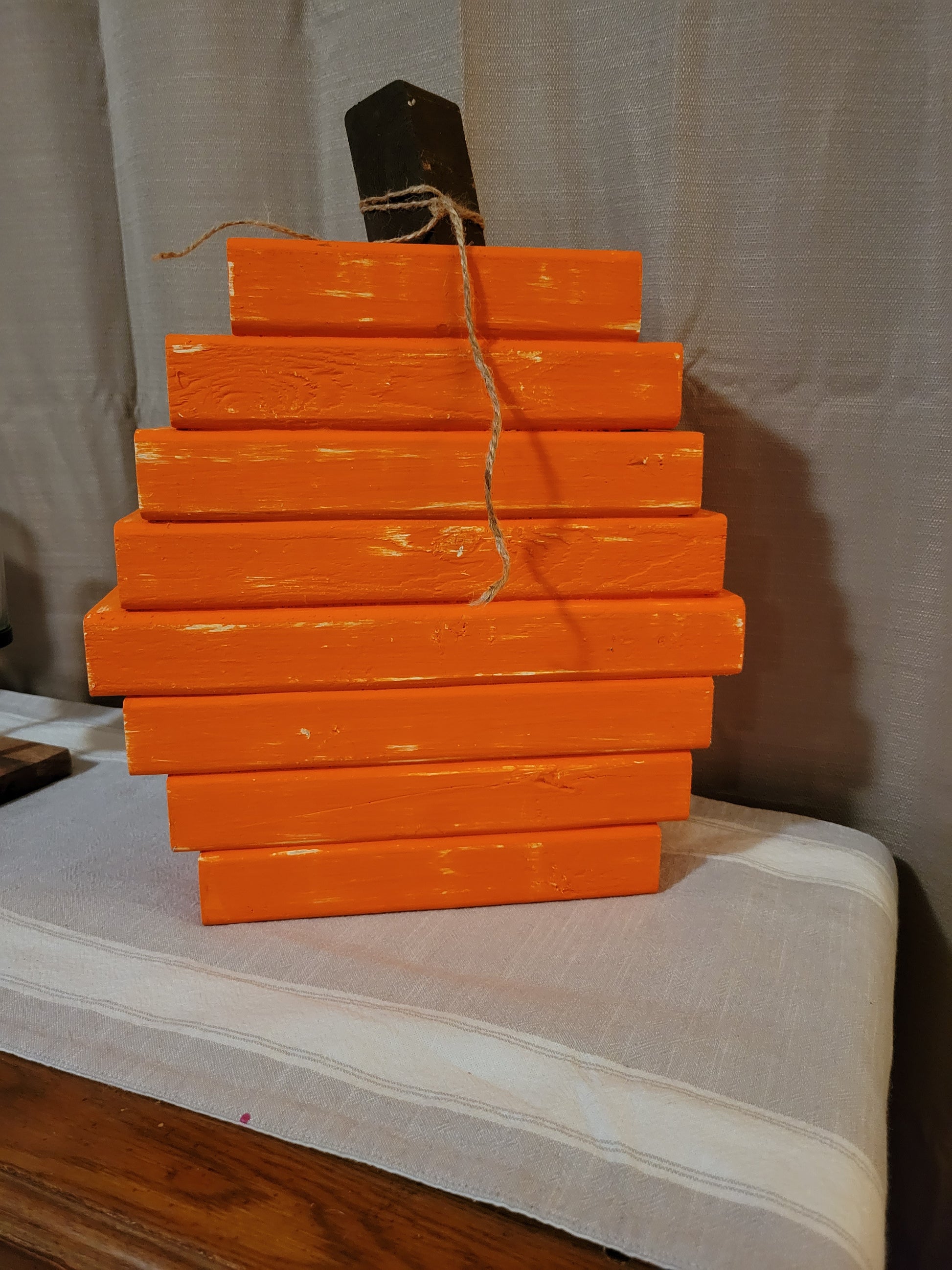 Large handcrafted 12"x15" pumpkin from 2x4 material, lightly distressed. Each piece is hand-coated twice with exterior paint to open up full creativity for indoor/outdoor decorating options. Made with love from our home to yours.