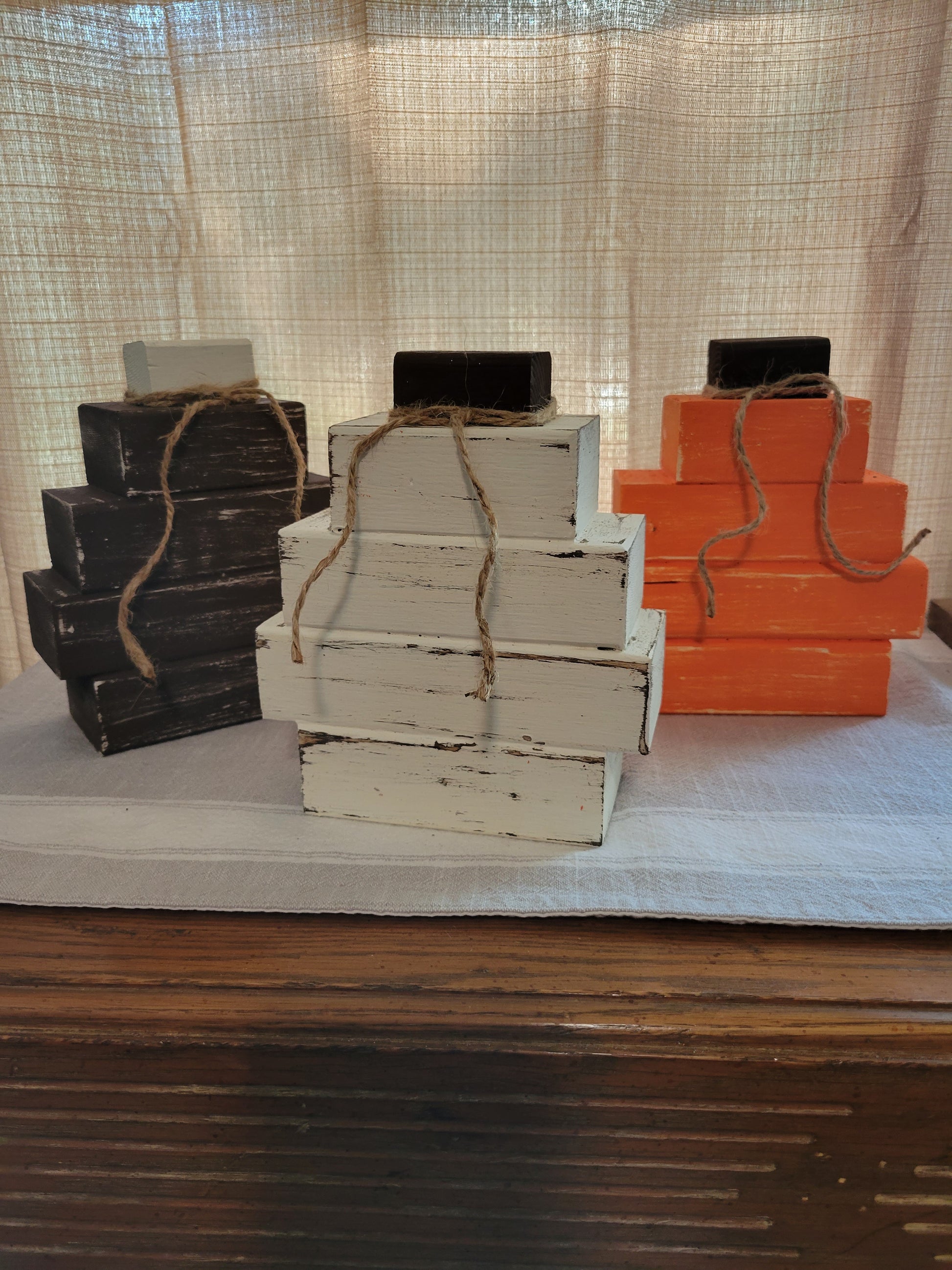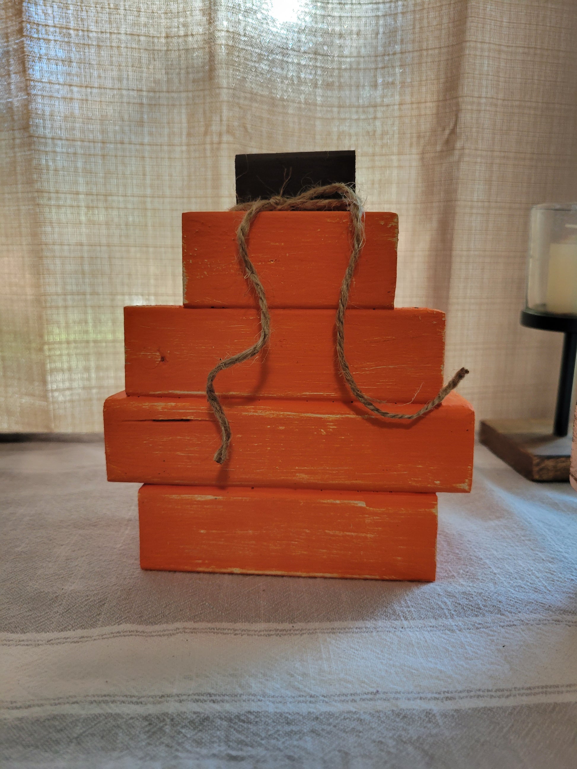 Small handcrafted 7"x6" pumpkin from 2x3 material, lightly distressed. Each piece is hand-coated twice with exterior paint to open up full creativity for indoor/outdoor decorating options. Made with love from our home to yours.